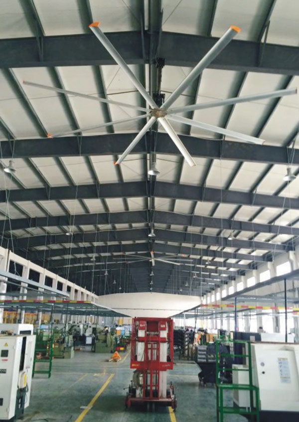 我公司生產的大型工業吊扇直接懸掛在廠房屋梁下,風力柔和,能加快車間空氣流通,有效降低車間內溫度,改善車間空氣環境質量,有利于員工的身體健康。